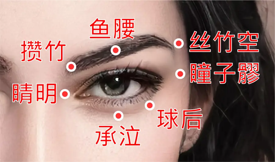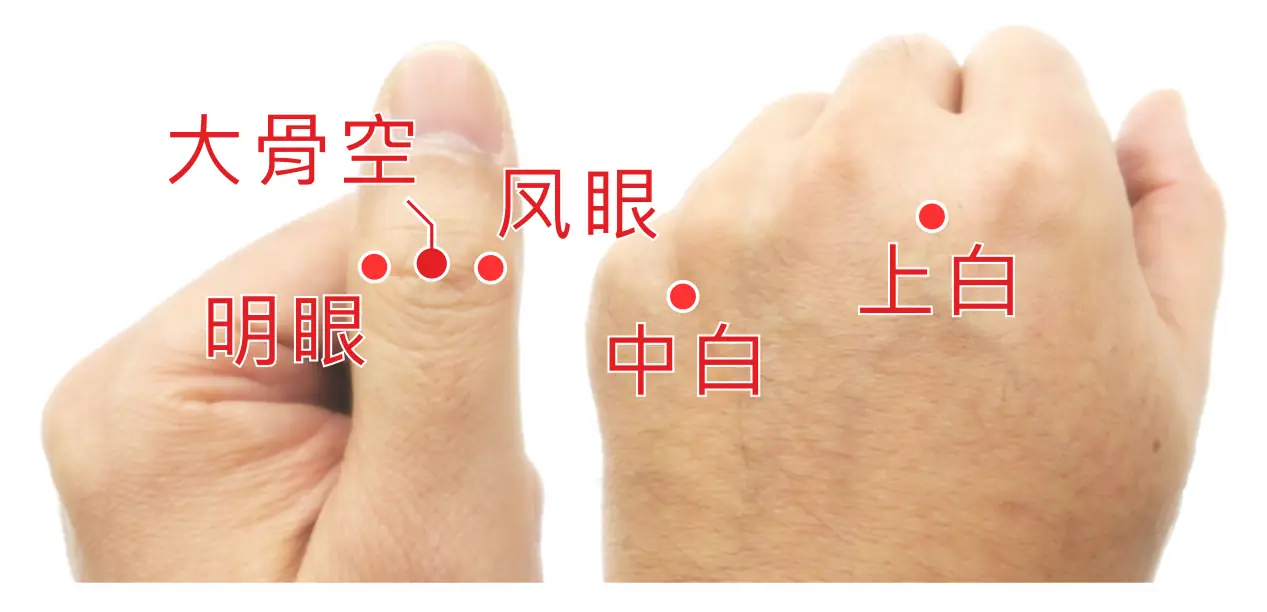 眼睛的穴道按摩︰眼睛周围有7个穴道,都位在局部的凹陷处或眼眶骨边缘,可轮流按压,按压时须注意勿按到眼球。大拇指关节的背侧有三个小穴位,分别位在关节中间及关节两侧斜面的中间凹陷处,可左、右手交替按压。手背第二三掌指关节前有个上白穴,对眼睛也有保健效果,稍微屈掌、用指探寻可摸到一小凹窝即是。