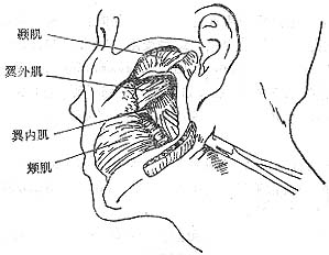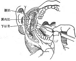 口內切口在下頜支前緣稍內側,即翼下頜皺臂稍外側,縱行切開2~3cm,血管鉗鈍性分離開頰肌後,即可沿下頜支內側進入翼下頜間隙(圖1)。
